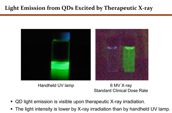 Yang and her colleagues realized that quantum dots also give off light when exposed to megavoltage x-rays, such as those used in cancer radiotherapy. That property, the scientists realized, makes quantum dots an ideal mediator in therapies employing light-activated compounds to treat cancer.