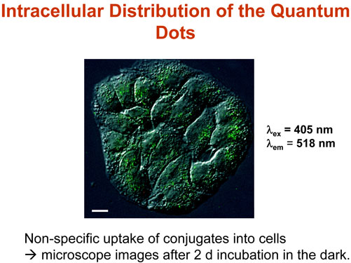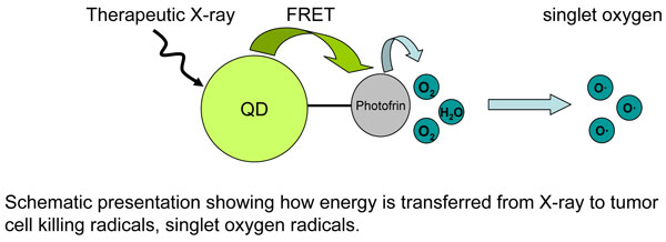 A compound called Photofrin is the only photosensitizer currently approved by the FDA. Photofrin is absorbed by cancer cells and, upon exposure to light, becomes active and kills cells. It is currently used to treat certain kinds of shallowly located tumors, but Yang and her colleagues realized that combing Photofrin with quantum dots could create an efficient method to kill even deeply seated cancer cells. Upon exposure to high doses of radiation, the dots become luminescent and emit light; that light triggers the cancer-killing activity of the Photofrin. In theory, the process, which so far has been studied only in cancer cells grown in culture, could work on tumors located too deep within the body to be reached by an external light source