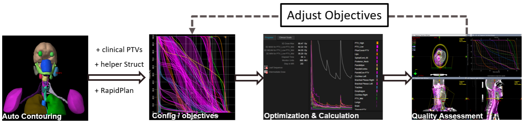 We use the CT and PTV masks from public datasets (cohorts will be disclosed after the Challenge), and create helper structures following the RapidPlan and ScoreCard in Varian Medical Affairs website https://medicalaffairs.varian.com/halcyon-case-studies. As shown in Figure 1, all the processes are run automatically.
