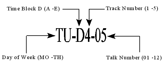 The numbering scheme encodes the day and time block into the abstract number. For example, for an abstract numbered as TU-D4-5, the TU corresponds to the day of the week (of SU, MO, TU, WE, TH), the D corresponds to the time block (of A, B, C, D, or E), the 4 corresponds to the track number (of 1 through 7). This is shown in the figure below: