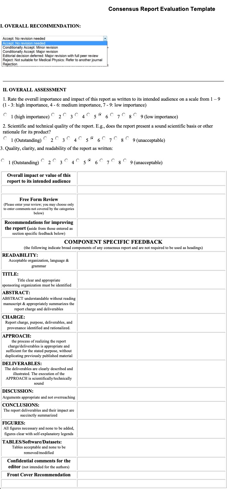 Review criteria for AAPM and other consensus reports differ significantly from those of original scientific manuscripts. They are more similar to, but not identical, to review criteria for Review Articles. Below are some guiding principles.