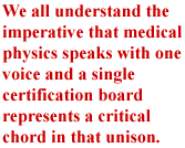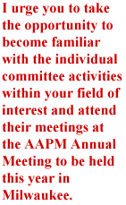 ![]() by Stephen R. Thomas Cincinnati, Ohio The Definition of Survival: The forces for change impacting the health care industry in recent years are obvious to all and may be expected to continue unabated over the near term. That the structure of health care delivery has been profoundly altered is not under debate. The issue which faces the medical profession in general, and our discipline of medical physics in specific, is how to develop and implement strategies for "survival" in this evolving environment. Here it is important to define what is meant by "survival" and to recognize the multifaceted dimensions encompassed by this term--the components of which cannot be universally applied to all but must be selectively adapted for individual circumstance. Certainly it includes bottom line economics and employment security, but also those less tangible aspects involving opportunity for continued professional development, maintenance of academic mission (for those in University settings), recognition by the physicians and administrators of our equivalent stature as professionals delivering a vital component of health care...to mention a few. But I am confident that none of us has forgotten the fundamental tenet associated with our medical profession, namely to promote, provide, and enhance quality health care for the community in need. Medical physicists contribute to this process through the unique expertise and quantitative capabilities which we bring to the field. Our "survival" by any definition depends on our continued fulfillment of this ideal. I am optimistic that we have identified avenues and will implement means for achieving success in this endeavor. It will call for foresight in areas of communication, proactive initiatives, and effective integration of innovative medical physics services within the health care system. One of my goals as President in 1997 is to ensure that the AAPM as an organization is responsive to these needs and will function as an aggressive proponent on behalf of the membership in all matters affecting professional survival. Thanks and A Sense of Responsibility: I begin this year as President of the AAPM with an acute sense of responsibility - common to all incoming Presidents. Therefore, I am pleased to report that the Association's foundation is indeed solid thanks to the conscientious and effective efforts of many individuals. Certainly principal among those are Past-President, Bhudatt Paliwal, Past Chairman-of-the-Board, Guy Simmons, and Treasurer, Jim Smathers. I want to extend particular gratitude on behalf of the AAPM to Charlie Coffey who has served for the past three years as Secretary par-excellence. Also, let me take this opportunity to welcome Jim Galvin as the incoming Secretary and Larry Rothenberg as President-Elect. There are many others who deserve to be recognized for their contributions to the AAPM over the past year and I plan to exercise the privilege of mentioning them in future columns. The positive "black ink" financial position of the AAPM is a bright spot. Success in this area, particularly as related to our annual meeting in Philadelphia, is due in a large part to the efforts of the Annual Meeting Coordination Committee under the Chairmanship of Ken Vanek, the Local Arrangements Committee under the leadership of Rene Smith, the Scientific Program Director and Co-Director, George Starkschall and Mitch Goodsitt, respectively, the Continuing Education Program Coordinator, Tony Seibert, and the Headquarters staff under the direction of Sal Trofi. (I will have more to say regarding the high efficiency of HQ operations in future reports.) This productive watch must continue and I have accepted the responsibility to ensure just that. Through Board action at the 1996 RSNA, we are committed to evaluating the potential for establishing a full years' operating budget in the Association's reserves within a 10 year timeframe. The Finance Committee has been charged with developing a program for Board consideration which should be necessarily comprehensive and far reaching. Stay tuned for the ongoing dialog in this area. Issues-of-Impact (IoIs): Through the course of 1997 I will be addressing what I define as Issues-of-Impact (IoIs) for the AAPM. These ![]() First, paramount within Category 1, we are under a resolve to establish a single unified certification process for medical physicists. The AAPM Board of Directors in Philadelphia endorsed creation of a Medical Physics Board Certification Council within the framework of the American Board of Radiology. This council, with representatives from AAPM, ACMP, and ACR COP (and possibly other organizations) would work with ABR Trustees on the structure, content and preceptor participation in certification examinations for medical physicists. The Council would nominate physics trustees to the ABR (with details to be worked out by the Council). Following ![]() As reported to the Board by Bhudatt at the RSNA, the Ad Hoc Committee met in initial session (November 1996). Eight recommendations were formulated which ranged from dedication to the concept of a single certification program for medical physicists, to specification of the membership and charge of the Medical Physics Certification Council (MPCC) within the ABR, to consideration of recognition of the equivalence of diplomats of the ABMP by the ABR through the MPCC. These events are highly positive. We all understand the imperative that medical physics speaks with one voice and a single certification board represents a critical chord in that unison. In my opinion, it is also vital that the medical physicist certification process maintain its position whereby it is recognized by the American Board of Medical Specialties (ABMS) which demonstrates to the world that the medical profession accepts medical physicists as professional equals. Currently this is the case under the ABR. The Ad Hoc Committee on Certification has the mandate to proceed to a fi